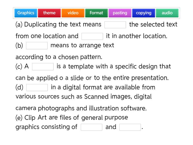 (a) Duplicating the text means ____ the selected text from one location and ____ it in another location. (b) ____ means to arrange text according to a chosen pattern. (c) A ____ is a template with a specific design that can be applied o a slide or to the entire presentation. (d) ____ in a digital format are available from various sources such as Scanned images, digital camera photographs and illustration software. (e) Clip Art are files of general purpose graphics consisting of ____ and ____. Shortcut Keys (a) Copying Text - Ctrl + ____ (b) Paste - Ctrl + ____ (c) Align text Right - Ctrl + ____ (d) Align text left - Ctrl + ____ (e) Select All- Ctrl + ____ (f) Italics- Ctrl + ____ (g) Run a Presentation - ____ (h) Save a Presentation - Ctrl + ____ (i) Open an existing Presentation - Ctrl + ____ (j) New Presentation - Ctrl + ____ (k) New Slide - Ctrl + ____ (l) Cut Text and Image - Ctrl + ____