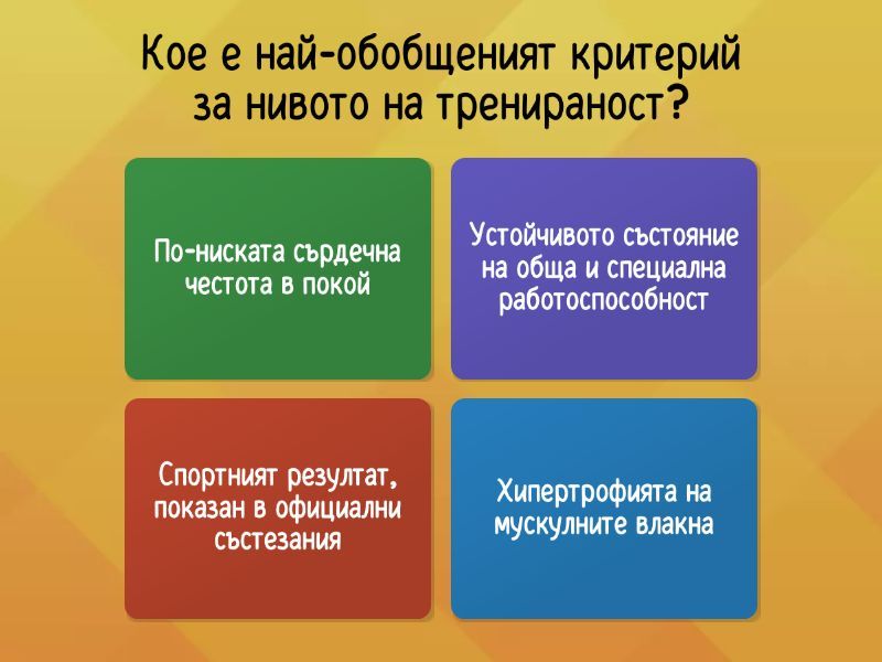 1) Кое е най-обобщеният критерий за нивото на тренираност? a) По-ниската сърдечна честота в покой b) Устойчивото състояние на обща и специална работоспособност c) Спортният резултат, показан в официални състезания d) Хипертрофията на мускулните влакна 2) Как се определя Тренираността по дефиниция? a) Като временно повишаване на работоспособността след загряване b) ато състояние на оптимална готовност за реализиране на високи спортни резултати c) Като спадане на работоспособността, свързано с изразходване на биоенергетични възможности d) Като устойчива адаптация на организма на повишена обща и специфична работоспособност 3) Кое от изброените състояния се изменя под влияние на еднократното прилагане на физическите упражнения и е преходно и лабилно a) Устойчиво състояние b) Текущо състояние c) Оперативно състояние d) Спортна форма 4) Кое от трите състояния на адаптация е най-важно от гледна точка на целите на тренировката и дава обобщаваща характеристика за нивото на работоспособност? a) Текущо състояние b) Оперативно състояние c) Устойчиво състояние 5) Кой е основният източник на енергия за спортовете от Първа група (максимална концентрация на усилия във времето, 20-25 s)? a) Кислородното осигуряване b) Гликолитичният резерв c) Липидният метаболизъм d) Креатинфосфатният резерв на организма 6) Кои спортове/дисциплини са типичен пример за Първа група? a) Маратон, Ски-бягане, Гребане b) Футбол, Баскетбол, Волейбол c) Спринтови дисциплини (до 25 s), Вдигане на тежести, Скокове в леката атлетика d) Плуване над 400 m, Колоездене (шосе) 7) Един от основните критерии за тренираност при Ацикличните спортове (хвърляния, вдигане на тежести) от Първа група е усъвършенстване на: a) Силовата издръжливост b) Вътрешно- и междумускулната координация c) Кислородното осигуряване d) Компенсираната умора 8) За коя група спортове е характерен аеробно-анаеробният (гликолитичен) характер на енергоосигуряване, с интервално-променлива двигателна дейност? a) Първа група b) Втора група c) Трета група 9) Кое от изброените е критерий за тренираност в Трета група спортове (спортни игри, единоборства)? a) Хипертрофия на мускулните влакна b) Максимално ефективна биодинамична структура в условията на прогресивно нарастваща умора c) По-ниска сърдечна честота в покой 10) Спортната форма се дефинира като: a) Текущо състояние на спортиста след участие в състезания b) Качествено ново състояние на тренираността, което отразява оптималната готовност за високи резултати c) Временно загубване на работоспособността d) Всяко състояние на адаптация на организма 11) Коя е Втората фаза в развитието на спортната форма? a) Запазване на спортната форма b) Временно загубване на спортната форма c) Навлизане в спортна форма 12) Третата фаза (Временно загубване на спортната форма) е закономерен етап, свързан с: a) Прекалено малко натоварване в тренировъчния процес b) Непосредствено формиране на спортната форма c) Рязко повишаване на тренираността d) Изразходване на биоенергетичните и психически възможности на спортиста 13) Кой тип динамика на спортните резултати е характерен за спортове, изискващи предимно издръжливост (маратон, ски-бягане, гребане)? a) Едновърхова крива b) Двувърхова крива с неголямо спадане c) Двувърхова крива с продължително спадане d) Тривърхова крива 14) Кой критерий за тренираност и спортна форма се отнас