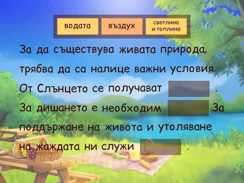За да съществува живата природа, трябва да са налице важни условия. От Слънцето се получават ____ . За дишането е необходим ____.За поддържане на живота и утоляване на жаждата ни служи ____ .