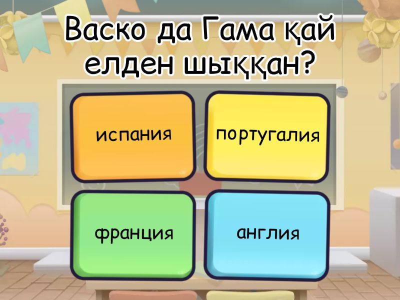 1) Васко да Гама қай елден шыққан? a) испания b) португалия c) франция d) англия 2) Джеймс Кук ашқан арал a) гавайи b) канар c) Мадагаскар d) Сицилия 3) Беллинсгаузен мен Лазарев не ашты? a) Гренландия b) Арктика c) Австралия d) Антарктида 4) Олар қай кемелермен жүзді? a) мирный Восток b) Фрам Йоа c) Индевор, фрам d) Виктория ,Санта-Мария 5) Николай Баранский қай ғылым саласын дамытты? a) Физикалық география b) Биология c) Экономикалық география d) Геология 6) Альфред Вегенер ұсынған теория a) Мұхит теориясы b) Континенттік дрейф c) Жердің жасы d) Климат теориясы 7) Қаныш Сәтпаев ашқан ірі кен орны: a) Жезқазған b) Қаратау c) Екібастұз d) Риддер 8) Марко Поло қай елден шыққан? a) Исландия b) Ирландия c) Англия d) Италия(Венеция) 9) Васко да Гама не ашты a) Африканы b) Американы c) Үндістанға теңіз жолын d) Австралияны 10) Христофор Колумб ашқан құрлық: a) Америка b) Африка c) Еуропа d) Австралия 11) Континенттік дрейф нені түсіндіреді? a) Құрлықтардын қозғалуын b) Желді c) Өзендерді d) климатты 12) Куктың 1-саяхаты қай жылдары болды? a) 1776–1779 b) 1642–1644 c) 1497-1499 d) 1768–1771 13) Абель Тасман қай елдің саяхатшысы? a) Нидерланд b) Англия c) Португалия d) Испания 14) Васко да Гама Үндістанға қай жылы жетті? a) 1505 b) 1498 c) 1497 d) 1504 15) Васко қай материкті айналып өтті? a) Америка b) Азия c) Африка d) Австралия 16) Фернан Магеллан нені дәлелдеді? a) Жер жалпақ b) Жердің шар тәрізді екенін c) Мұхиттар таяз екенін d) Құрлықтар қозғалмайды екенін 17) Шоқан Уәлиханов қай көлді зерттеді? a) Ыстық көл b) Балқаш c) Байкал d) Каспий 18) Александр Гумбольдт зерттеген аймақ: a) Еуропа b) Африка c) Оңтүстік Америка d) Солтүстік Америка 19) Давид Ливингстон қай құрлықты зерттеді? a) Еуропа b) Америка c) Африка d) Азия 20) Шоқан Уәлиханов зерттеген аймақ: a) Орталық Азия b) Еуропа c) Африка d) Америка 21) Гумбольдт ашқан заңдылық: a) Климаттық белдеу b) Мұхит ағысы c) Континенттік дрейф d) Биіктік белдеулік 22) Колумб қай ел атынан саяхат жасады? a) Исландия b) Испания c) Италия d) Франция 23) Марко Поло қалай саяхаттады? a) Тек кемемен b) Әуе арқылы c) Құрлық жолымен d) Мұз үстімен 24) Абель Тасман ашқан арал: a) Тасмания b) Гавайи c) Куба d) Исландия 25) Руаль Амудсен кім? a) Африка зерттеушісі b) Геолог c) Теңіз қарақшысы d) Поляр зерттеуші 26) Қаныш Сәтпаев кім? a) Геолог-Ғалым b) Теңізші c) Саяхатшы d) Астроном 27) Магеллан бұғазы қай материкте? a) Африка b) Солтүстік Америка c) Оңтүстік Америка d) Еуропа 28) Амудсен бірінші жеткен полюс: a) Батыс b) Солтүстік c) Экватор d) Оңтүстік 29) Ливингстон ашқан сарқырама: a) Виктория b) Ниагара c) Анхель d) Игуасу 30) Джеймс Кук қай елден шыққан? a) Франция b)  Англия c) Нидерланд d) Испания