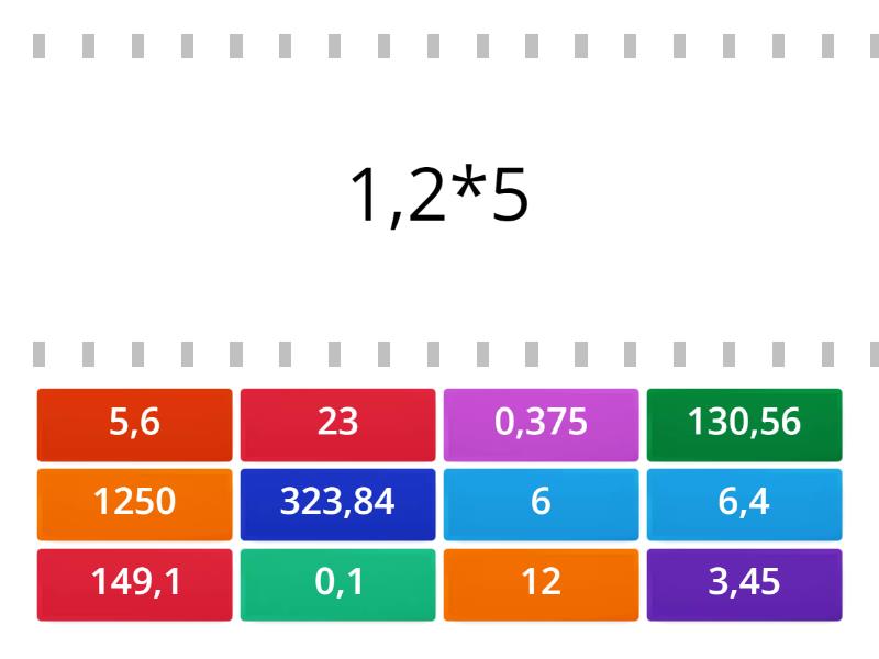 6 - 1,2*5, 23 - 4,6*5, 12 - 0,12*100, 130,56 - 4,08*32, 0,375 - 0,3*1,25, 323,84 - 5,06*64, 0,1 - 0,08*1,25, 5,6 - 1,4*4, 3,45 - 345*0,01, 6,4 - 0,8*8, 149,1 - 7,1*21, 1250 - 24,5*50,