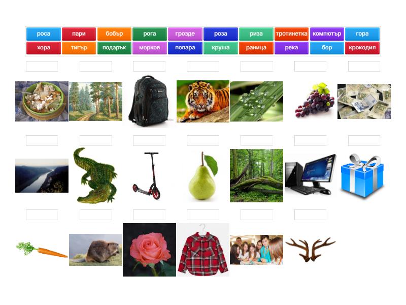 роза, река, риза, роса, рога, пари, попара, гора, хора, морков, бор, бобър, крокодил, тигър, круша, грозде, подарък, раница, тротинетка, компютър,