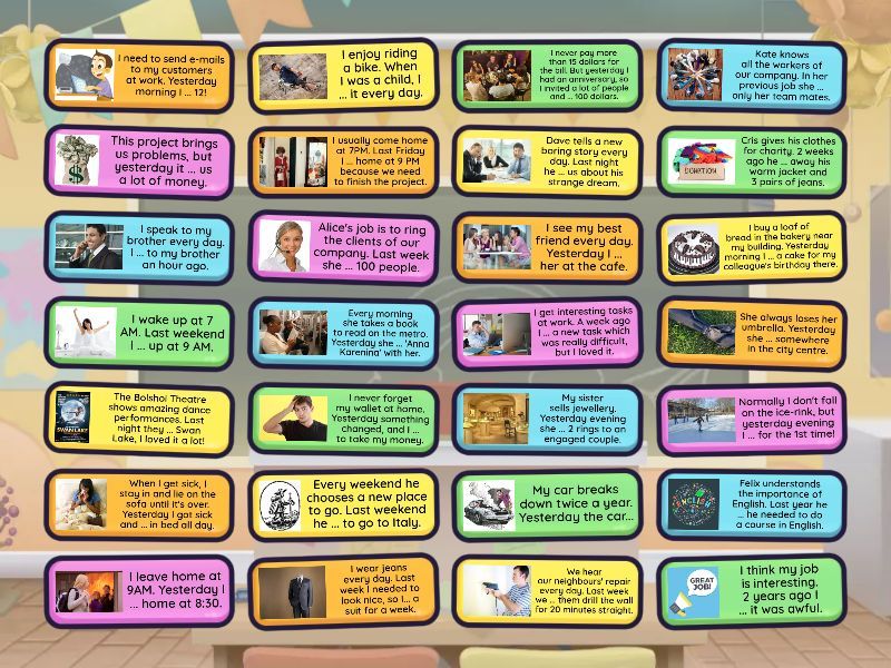 My car breaks down twice a year. Yesterday the car... - Yesterday the car broke down., I speak to my brother every day. I ... to my brother an hour ago. - I spoke to my brother an hour ago., I wake up at 7 AM. Last weekend I ... up at 9 AM. - Last weekend I woke up at 9AM. , My sister sells jewellery. Yesterday evening she ... 2 rings to an engaged couple. - She sold two rings to an engaged couple., Dave tells a new boring story every day. Last night he ... us about his strange dream. - Last night he told us about his strange dream., I enjoy riding a bike. When I was a child, I ... it every day. - When I was a child I rode it every day., The Bolshoi Theatre shows amazing dance performances. Last night they ... Swan Lake, I loved it a lot! - Last night they showed Swan Lake., Every weekend he chooses a new place to go. Last weekend he ... to go to Italy. - Last weekend he chose to go to Italy., This project brings us problems, but yesterday it ... us a lot of money. - Yesterday it brought us a lot of money., I buy a loaf of bread in the bakery near my building. Yesterday morning I ... a cake for my colleague's birthday there. - Yesterday morning I bought a cake for my colleague's birthday there. , I think my job is interesting. 2 years ago I ... it was awful. - 2 years ago I thought it was awful., I see my best friend every day. Yesterday I ... her at the cafe. - Yesterday I saw her at the cafe. , I wear jeans every day. Last week I needed to look nice, so I... a suit for a week. - So I wore a suit for a week., I get interesting tasks at work. A week ago I ... a new task which was really difficult, but I loved it. - I got a task which was really difficult., I never forget my wallet at home. Yesterday something changed, and I ... to take my money. - I forgot to take my money., Kate knows all the workers of our company. In her previous job she ... only her team mates. - In her previous job she knew only her team mates., Felix understands the importance of English. Last year he ... he needed to do a course in English. - Last year he understood that he needed to do a course in English., Every morning she takes a book to read on the metro. Yesterday she ... 'Anna Karenina' with her. - Yesterday she took 'Anna Karenina'., Alice's job is to ring the clients of our company. Last week she ... 100 people. - Last week she rang 100 people., She always loses her umbrella. Yesterday she ... somewhere in the city centre. - Yesterday she lost it somewhere in the city centre., We hear our neighbours' repair every day. Last week we ... them drill the wall for 20 minutes straight. - Last week we heard them drill the wall for 20 minutes straight. , I leave home at 9AM. Yesterday I ... home at 8:30. - Yesterday I left home at 8:30., I need to send e-mails to my customers at work. Yesterday morning I ... 12! - Yesterday morning I sent 12!, Normally I don't fall on the ice-rink, but yesterday evening I ... for the 1st time! - Yesterday I fell for the 1st time!, I usually come home at 7PM. Last Friday I ... home at 9 PM because we need to finish the project. - Last Friday I came home at 9 PM., I never pay more than 15 dollars for the bill. But yesterday I had an anniversary, so I invited a lot of people and ... 100 dollars. - I paid 100 dollars!, Cris gives his clothes for charity. 2 weeks ago he ... away his warm jacket and 3 pairs of jeans. - He gave away his warm jacket and 3 pairs of jeans., When I get sick, I stay in and lie on the sofa until it's over. Yesterday I got sick and ... in bed all day. - I lay in bed all day. ,