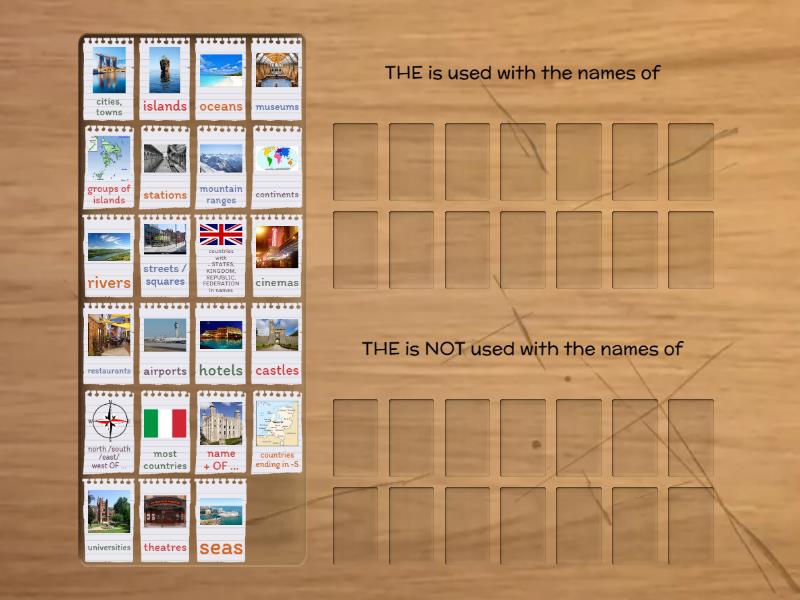 THE is used with the names of: rivers, seas, oceans, mountain ranges, groups of islands, countries with - STATES, KINGDOM, REPUBLIC, FEDERATION in names, countries ending in -S, hotels, restaurants, cinemas, theatres, museums, name + OF ..., north /south /east/ west OF ..., THE is NOT used with the names of: most countries, cities, towns, continents, islands, streets / squares, airports, stations, universities, castles,