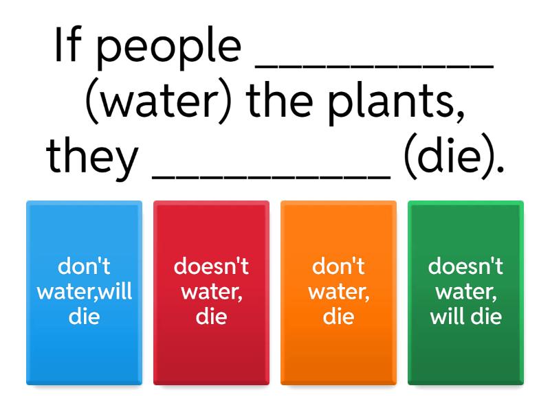 1) If people __________ (water) the plants, they __________ (die). a) don't water,will die b) doesn't water, die c) don't water, die d) doesn't water, will die 2) If the weather __________ (be) nice tomorrow, we __________ (go) on a biking trip. a) is, will go b) will be, go c) is, goes d) will be, will go 3) I _________ (not/help) you if you __________ (ask) me. a) don't help, won't ask b) won't help, won't ask c) don't help, ask d) won't help, don't ask 4) He usually__________ (take) a painkiller if he __________ (have) a headache. a) will take, have b) takes, has c) will takes, has d) take, have 5) If Jane __________ (finish) High School, she __________ (go) to university next year. a) finishes, will go b) will finish, goes c) finish, goes d) finish, go 6) If you __________ (be) thirsty , you __________ (drink). a) are, drinks b) will be, drinks c) are, drink d) will be, will drink 7) If we __________ (arrive) home on time, we __________(call) you. a) will arrive, call b) arrives, will call c) will arrives, calls d) arrive, will call 8) When my parents _________ (work) hard, they _________ (feel) tired. a) work, will feels b) work, feel c) will work, felt d) works, feel 9) Andrew __________ (not/go) to the cinema if he __________ (buy) the tickets. a) won't go, doesn't buy b) doesn't go, won't buy c) won't go, don't buy d) doesn't go, won't buys 10) If Jim ____________ (not/study), he ____________ (not/pass) the exam. a) don't studies, won't pass b) doesn't studies, doesn't passes c) doesn't study, doesn't pass d) don't study, don't pass 11) If it ______________________, we____________________ at home. a) rains, stays b) rain, will stay c) rains, will stay d) will rain, will stay