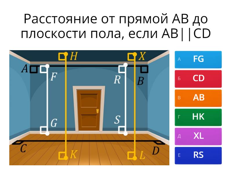 1) Расстояние от плоскости пола до плоскости потолка a) FG b) RS c) AB d) HK e) XL f) CD 2) Расстояние от прямой AB до плоскости пола, если AB||CD a) FG b) CD c) AB d) HK e) XL f) RS 3) Расстояние между противоположными стенами комнаты a) FG b) CD c) AB d) HK e) XL f) RS