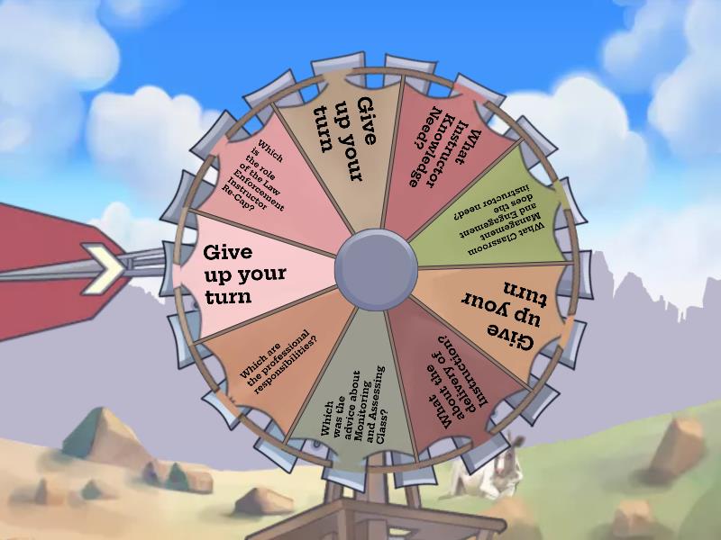 Which is the role of the Law Enforcement Instructor Re-Cap?, Give up your turn, What Instructor Knowledge Need?, What Classroom Management and Engagement does the instructor need?, Give up your turn, What about the delivery of Instruction?, Which was the advice about Monitoring and Assessing Class?, Which are the professional responsibilities?, Give up your turn.