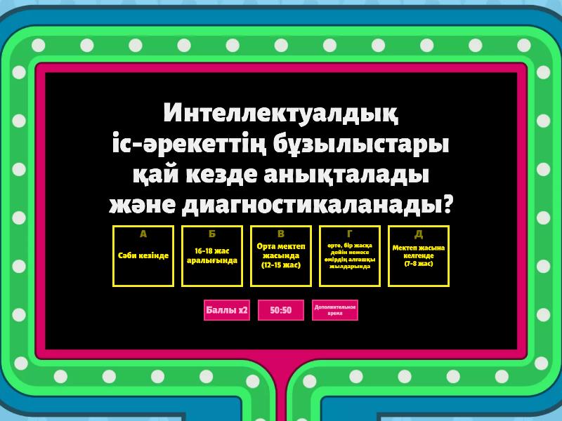 1) Интеллектуалдық іс-әрекеттің бұзылыстары қай кезде анықталады және диагностикаланады? a) Сәби кезінде b) 16-18 жас аралығында c) Орта мектеп жасында (12-15 жас) d) ерте, бір жасқа дейін немесе өмірдің алғашқы жылдарында e) Мектеп жасына келгенде (7-8 жас) 2) Инклюзивті білім беру жағдайындағы мұғалімнің психологиялық даярлығына не жатпайды? a) Балалардың оқу іс-әрекетін қалыптастыру b) Инклюзивті білім беру жағдайында сабақты жобалай алу c) Оқытудың қолайлы әдісін іздеу d) алалардың мінез-құлық әрекетін диагностикалау e) Ата-аналарға кеңес беру 3) Инклюзивті білім беру балаларға қандай мүмкіндіктер береді? a) Оқу іс-әрекетінде жетістіктерге жетуге b) Еңбектік іс-әркеттерде жетістікке жетуге c) Достарымен жақсы қарым-қатынаста болуға d) Барлық балаларға толық мөлшерде қоғамның өміріне қатысуға e) Өз мүмкіндіктерін іске асыруға 4) Ресейдегі инклюзивті білім беру дами бастады a) 1998 b) 2002 c) 1991 d) 1993 e) 1999 5) Инклюзивті білім беру шет елдерде нешінші жылдан бастау алды a) 1989 b) 1975 c) 1965 d) 1991 e) 1970 6) Ерекше білім беруге қажеттілігі бар оқушылардың білімдерін бағалаудың негізгі неше функциялары бар? a) 5 b) 8 c) 6 d) 7 e) 4 7) Білім алушылардың білімін бағалау өлшемшарттары Қазақстан Республикасы Білім және ғылым министрінің «Білім алушылардың білімін бағалау өлшемшарттарын бекіту туралы» 2016 жылғы 21 қаңтардағы нешінші бұйрығымен бекітілді a) № 343 b) № 52 c) № 179 d) № 77 e) № 319 8) Ерекше оқыту қажеттілігі бар білім алушылардың оқу жетістігін бағалау өлшемшарттары келесі ережелерге негізделген: a) біледі, түсінеді, қолданады b) талдайды, жинақтайды, бағалайды c) біледі, түсінеді, қолданады, талдайды, жинақтайды, бағалайды d) түсінеді, талдайды, бағалайды e) біледі, қолданады, жинақтайды 9) Қазақстан 2008 жылы БҰҰ-ның қандай Конвенциясына қол қойылды? a) Мүгедектердің өмір сапасын жақсарту жөніндегі ұлттық жоспар b) Адам құқықтары жайлы c) Мүгедектердің құқықтары туралы d) Білім туралы e) Бала құқықтары туралы 10) Инклюзивті оқытудың негізгі принциптері қанша? a) 8 b) 6 c) 5 d) 7 e) 4