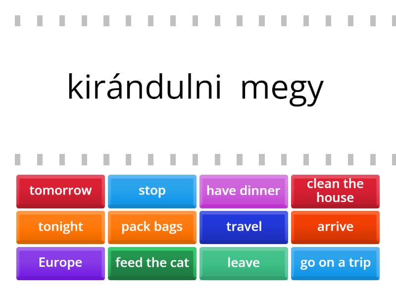 go on a trip - kirándulni megy, clean the house - kitakarítja a házat, pack bags - bepakolja a táskákat, feed the cat - megeteti a macskát, have dinner - vacsorázik, travel - utazik, leave - elindul, arrive - megérkezik, Europe - Európa, stop - megálló, állomás, tomorrow - holnap, tonight - ma este,