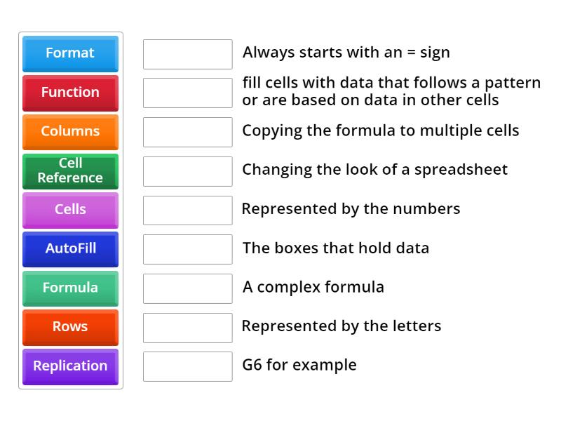 Cells - The boxes that hold data, Cell Reference - G6 for example, Format - Changing the look of a spreadsheet, Formula - Always starts with an = sign, Function - A complex formula, Rows - Represented by the numbers, Columns - Represented by the letters, Replication - Copying the formula to multiple cells , AutoFill - fill cells with data that follows a pattern or are based on data in other cells,