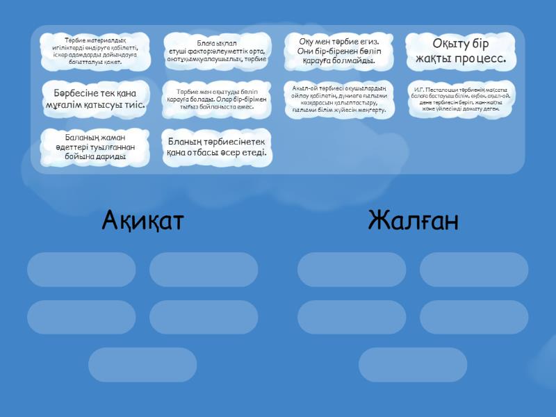 Ақиқат: Оқу мен тәрбие егиз. Они бір-біренен бөліп қарауға болмайды., Тәрбие материалдық игіліктерді өндіруге қабілетті, іскер адамдарды дайындауға бағытталуы қажет., И.Г. Песталоцци тәрбиенің мақсаты балаға бастауыш білім, еңбек, ақыл-ой, дене тербиесін беріп, жан-жақты және үйлесімді дамыту деген., Акыл-ой тәрбиесі оқушылардың ойлау қабілетін, дүниеге ғылыми көзқарасын қалыптастыру, ғылыми білім жүйесін меңгерту., Блаға ықпал етуші фактор:әлеуметтік орта, оютұқымқуалаушылық, тәрбие, Жалған: Бәрбесіне тек қана мұғалім қатысуы тиіс., Бланың тәрбиесінетек қана отбасы әсер етеді., Оқыту бір жақты процесс., Тәрбие мен оқытуды бөліп қарауға болады. Олар бір-бірімен тығыз байланыста емес., Баланың жаман әдеттері туылғаннан бойына дариды,