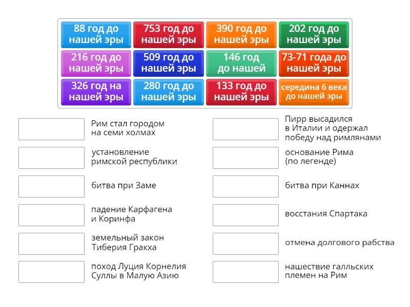 753 год до нашей эры - основание Рима (по легенде), середина 6 века до нашей эры - Рим стал городом на семи холмах, 509 год до нашей эры - установление римской республики, 390 год до нашей эры - нашествие галльских племен на Рим, 326 год на нашей эры - отмена долгового рабства, 280 год до нашей эры - Пирр высадился в Италии и одержал победу над римлянами, 216 год до нашей эры - битва при Каннах, 202 год до нашей эры - битва при Заме, 146 год до нашей - падение Карфагена и Коринфа, 133 год до нашей эры - земельный закон Тиберия Гракха, 88 год до нашей эры - поход Луция Корнелия Суллы в Малую Азию, 73-71 года до нашей эры - восстания Спартака,