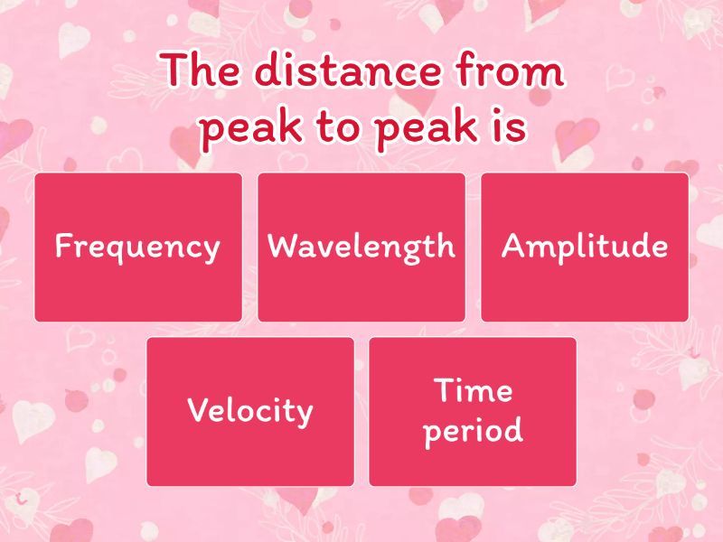 1) The distance from peak to peak is a) Frequency b) Wavelength c) Amplitude d) Velocity e) Time period 2) The distance from mid line to peak is a) Frequency b) Wavelength c) Amplitude d) Velocity e) Time period 3) This is measured in hertz and tells us how many waves pass in a second a) Frequency b) Wavelength c) Amplitude d) Velocity e) Time period 4) This tells us how long it takes for one wave. It is measured in seconds a) Frequency b) Wavelength c) Amplitude d) Velocity e) Time period 5) Velocity a) Has magnitude only b) Has direction only c) Is a vector d) Has magnitude and direction e) Is a scalar 6) Light waves are a) Longitudinal b) Transverse 7) Sound waves are a) Longitudinal b) Transverse 8) Glass is more dense than air a) True b) False 9) The bending of light is called a) Reflection b) Transmission c) Refraction d) Refractive index 10) Velocity = frequency x wavelength so frequency is equal to a) Velocity x wavelength b) Wavelength/velocity c) Velocity/wavelength 11) Refraction happens because a) Light changes speed when it enters a new medium b) Light is reflected at a boundary c) Light changes frequency when it enters a new medium 12) The incident ray is a) The ray travelling in the new medium (glass block) b) The light travelling from the ray box c) The light emerging from the other side of the block 13) The refracted ray is  a) The ray travelling in the new medium (glass block) b) The light travelling from the ray box c) The light emerging from the other side of the block 14) The equipment we use to measure angles a) Ruler b) Tape measure c) Protractor d) A balance 15) Wavelength is measured in a) cm b) mm c) m d) Km