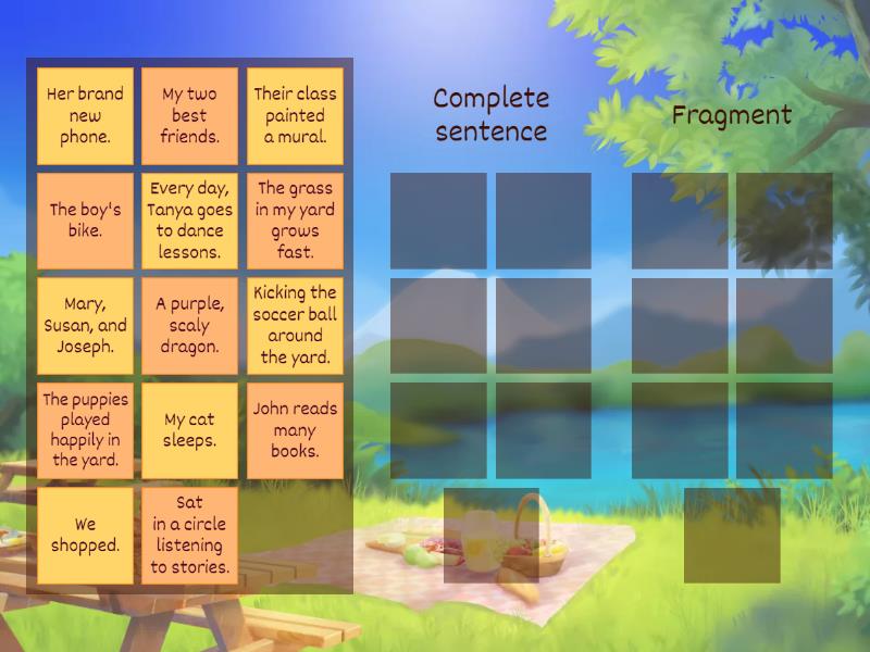 Complete sentence: We shopped., The puppies played happily in the yard., John reads many books., Every day, Tanya goes to dance lessons., My cat sleeps., Their class painted a mural., The grass in my yard grows fast., Fragment: Mary, Susan, and Joseph., Sat in a circle listening to stories., My two best friends., A purple, scaly dragon., Kicking the soccer ball around the yard., The boy's bike. , Her brand new phone. ,