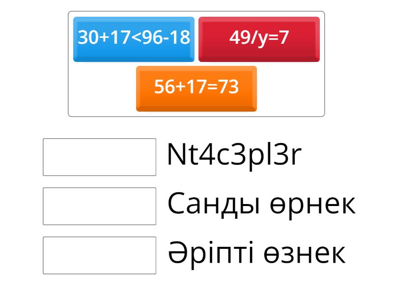 56+17=73 - Санды өрнек, 49/у=7 - Әріпті өзнек, 30+17<96-18 - Nt4c3pl3r,