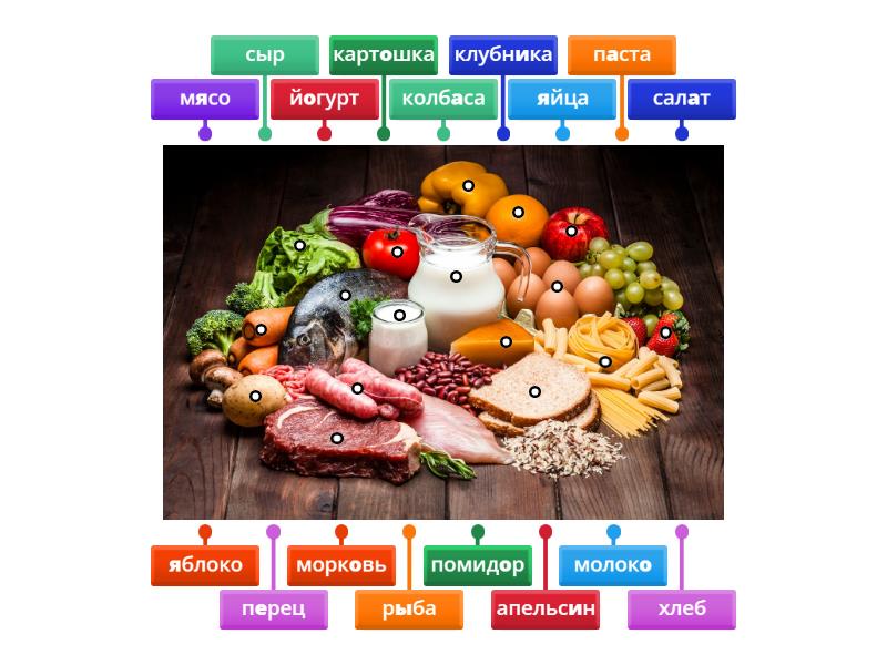 молоко, йогурт, рыба, помидор, перец, салат, сыр, яблоко, мясо, яйца, апельсин, паста, картошка, хлеб, клубника, колбаса, морковь.