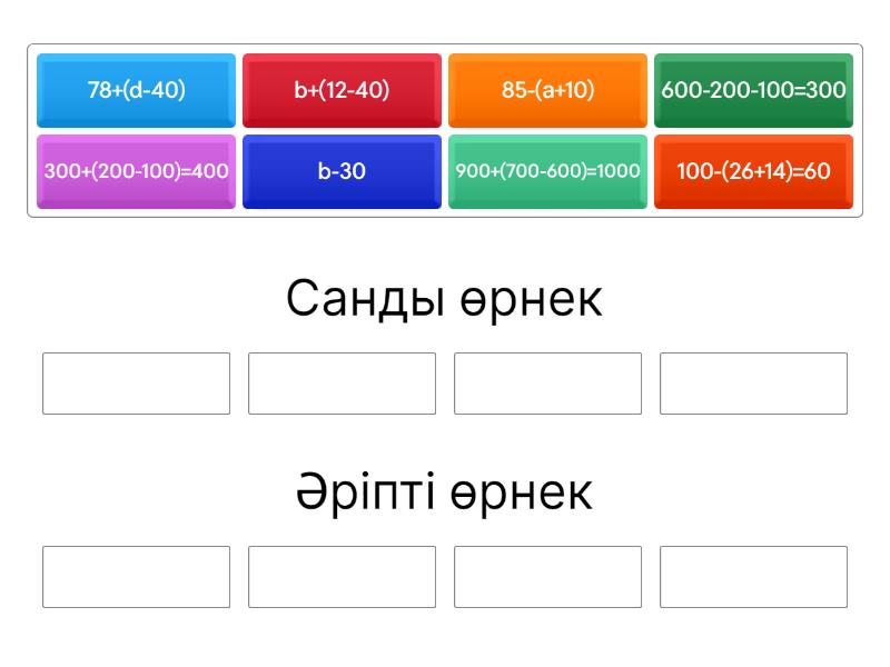 Санды өрнек: 100-(26+14)=60, 900+(700-600)=1000, 600-200-100=300, 300+(200-100)=400, Әріпті өрнек: 85-(а+10), 78+(d-40), b+(12-40), b-30,