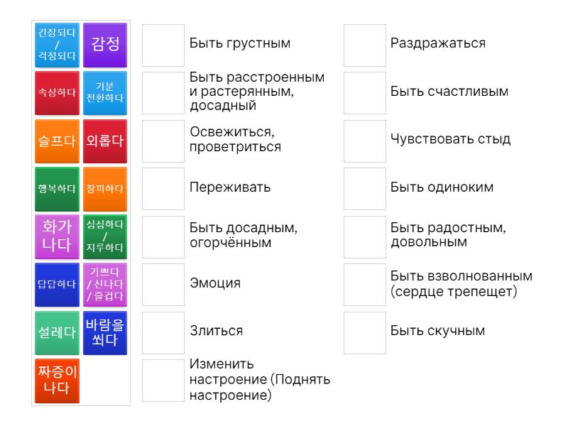 감정 - Эмоция, 심심하다 / 지루하다 - Быть скучным, 기쁘다 / 신나다 / 즐겁다 - Быть радостным, довольным, 슬프다 - Быть грустным, 화가 나다 - Злиться, 행복하다 - Быть счастливым, 외롭다 - Быть одиноким, 창피하다 - Чувствовать стыд, 속상하다 - Быть досадным, огорчённым, 답답하다 - Быть расстроенным и растерянным, досадный, 긴장되다 / 걱정되다 - Переживать, 짜증이 나다 - Раздражаться, 바람을 쐬다 - Освежиться, проветриться, 기분 전환하다 - Изменить настроение (Поднять настроение), 설레다 - Быть взволнованным (сердце трепещет),