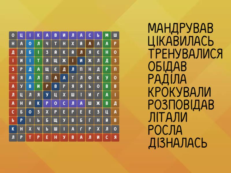 Мандрував, Цікавилась, Тренувалися, Обідав, Раділа , Крокували, Розповідав, Літали, Росла, Дізналась,