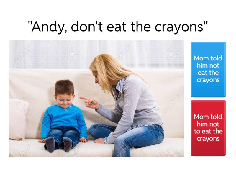 1) "Andy, don't eat the crayons" a) Mom told him not eat the crayons b) Mom told him not to eat the crayons 2) "Marco, listen to me!" a) Mom told Marco to listen to her b) Mum told Marco listen her 3) "Clean up your room" a) Mom said Tim clean his room b) Mom told Tim to clean up his room 4) "Sit!" a) He told the dog to sit b) He told sit dog 5) "Tom, please don't listen to loud music". a) Jerry told Tom to listen to loud music. b) Jerry told Tom not to listen to loud music. 6) "You need to lose weight." a) The doctor told Stanley to lose weight. b) The doctor tell Stanley lose weight. 7) My English teacher told me ________ movies with the subtitles on. a) watching b) to watch 8) "You can help me do the dishes." a) Mom told me to help do the dishes b) Mom not told me to help do the dishes 9) My doctor told me ________ more than 2,000 calories a day. a) not to eat b) to no eat 10) My yoga teacher ________ to a higher-level class. a) told me no go b) told me to go 11) Mom _________ the doctor a) told me I need to go to the doctor  b) told go to the doctor 12) Dad told Billy ______ sleep. a) go b) go to