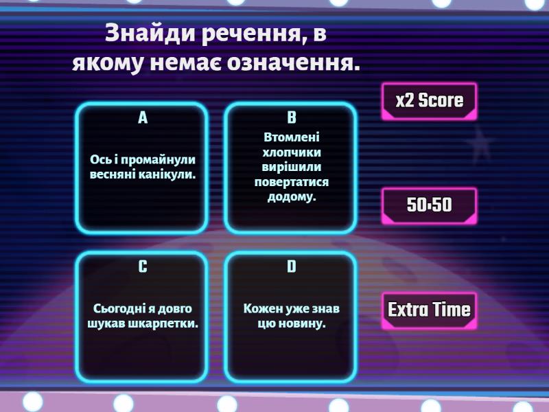 1) Знайди речення, в якому немає означення. a) Ось і промайнули весняні канікули. b) Втомлені хлопчики вирішили повертатися додому. c) Сьогодні я довго шукав шкарпетки. d) Кожен уже знав цю новину. 2) У якому реченні визначення відповідає на питання чий? чия? або чиє?  a) Домашнє завдання цього разу було цікавим. b) Чого тільки не було у бабусиній скрині! c) Де тільки й набралося стільки охочих! d) Заходили всі у відчинені ворота. 3) У якому реченні визначення НЕ відповідає на питання який? яка? яке? a) І перший, і другий гравець не забив гол. b) Літній день рік годує. c) Щаслива та людина, яка уміє турбуватися про ближнього. d) До нас приїхали поважні гості. 4) Яке речення має в своєму складі й додаток, і означення? a) На узвишші стояв похмурий замок. b) Знадвору зайшов високий чоловік. c) Ми мали б приїхати ще вчора. d) Тобі сьогодні подарують щось гарне. 5) Речення "Упродовж усієї історії українці боролися за свою незалежність" a) Має тільки другорядний член додаток. b) Має тільки головні члени речення. c) Моє тільки другорядний член означення. d) Має всі другорядні члени речення. 6) У якому реченні є два означення? a) Наш клас дуже дружний. b) Кожен українець знає пісню про червону калину. c) Завтра буде чудова погода. d) Мужні воїни стоять на захисті Батьківщини.