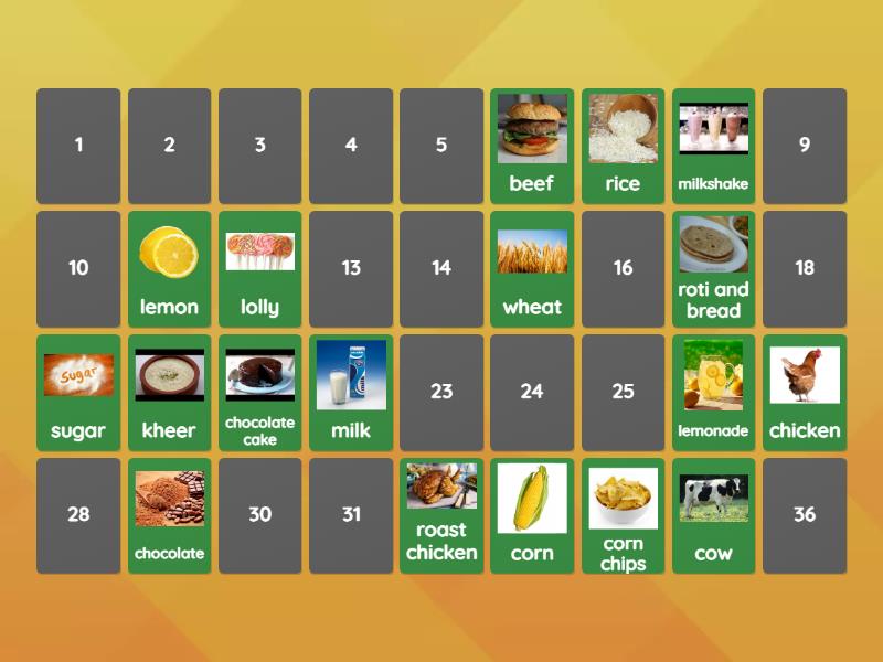 corn - corn chips, wheat - roti and bread, rice - kheer, sugar - lolly, chocolate - chocolate cake, chicken - roast chicken, cow - beef, milk - milkshake, lemon - lemonade, carrot - gajar halwa, egg - chicken, maple tree - maple syrup, bee - honey, apple - apple pie, banana - banana bread, lentil/daal - daal, chilli - chilli powder, haldi/turmeric - haldi/turmeric powder,