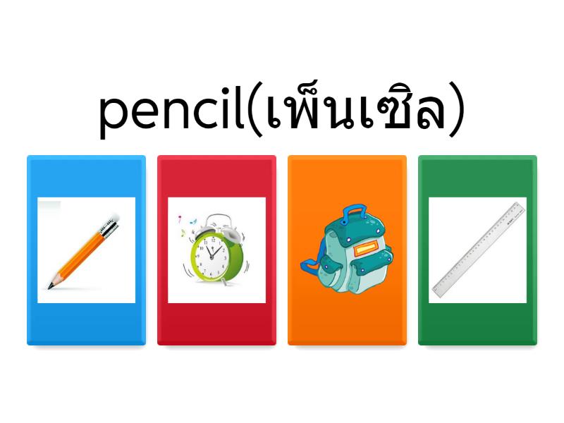 1) pencil(เพ็นเซิล) a) b) c) d) 2) ruler(รูล-เลอะ) a) b) c) d) 3) Eraser (อิน-เร๊-เซอะ) a) b) c) d) 4) Pencil sharpener(เพน-ซิล-ชาร์-เพอะ-เนอะ) a) b) c) d) 5) pen(เพ็น) a) b) c) d) 6) book(บุค) a) b) c) d) 7) scissors(ซิล-เซอซ) a) b) c) d) 8) glue(กลู) a) b) c) d) 9) Table (เท-เบิล) a) b) c) d) 10) Notebook(โน๊ต-บุค) a) b) c) d) 11) Chair(แชร์) a) b) c) d) 12) Blackboard(แบล็ค-บอร์ด) a) b) c) d) 13) Paper(เพ-เพอะ) a) b) c) d) 14) Pencil case เพน-ซิล-เคส) a) b) c) d) 15) School bag(สคูล-แบค) a) b) c) d)