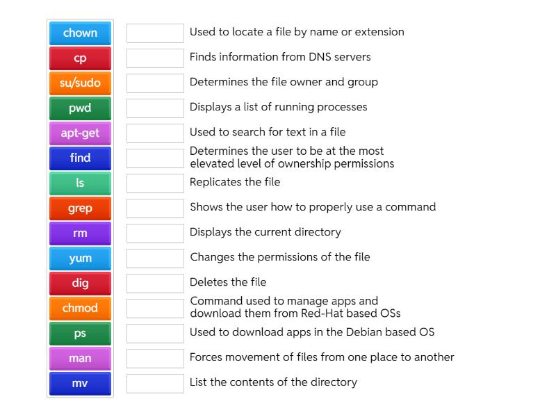 ls - List the contents of the directory, pwd - Displays the current directory, mv - Forces movement of files from one place to another, cp - Replicates the file, rm - Deletes the file, chmod - Changes the permissions of the file, chown - Determines the file owner and group, su/sudo - Determines the user to be at the most elevated level of ownership permissions, apt-get - Used to download apps in the Debian based OS, yum - Command used to manage apps and download them from Red-Hat based OSs, grep - Used to search for text in a file, ps - Displays a list of running processes, man - Shows the user how to properly use a command, find - Used to locate a file by name or extension, dig - Finds information from DNS servers,