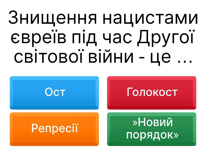 1) Знищення нацистами євреїв під час Другої світової війни - це … a) Ост b) Голокост c) Репресії d) »Новий порядок» 2) Звання «Праведник народів світу» отримують тільки неєвреї a) Так b) Ні 3) Якої умови для отримання звання «праведник народів світу» немає? a) Допомога була безкорисною b) Факт допомоги має бути підтверджений c) Той, хто допомагав європеєць d) Той, хто допомагав ризикував життям 4) На 2023 рік таке звання мають близько a) 17,5 тисяч b) 28,5 тисяч c) 23.6 тисяч d) 15,8 тисяч 5) Як «праведники» допомагали євреям? a) Надавали фальшиві документи b) Переховували у себе c) Організовували втечу d) Всі варіанти правильні 6) Праведники народів світу мають право на пенсію від Ізраїля та медичну допомогу a) Так b) Ні 7) Яке місто посідає Україна в світі за кількістю Праведників a) 1 b) 2 c) 3 d) 4 8) Кого рятувала Ірен Сендлерова? a) Єврейських жінок b) Єврейських дітей c) Важкохворих євреїв d) Єврейських вчених 9) Скількох дітей вдалося врятувати Ірен Сендлеровій та її команді? a) 1000 b) 1500 c) 2000 d) 2500 10) Де Ірен ховала справжні відомості про врятованих єврейських дітей? a) У фальшивому дні дорожнього чемодану b) У скляних банках, заритих в землю c) Під дерев´яною підлогою варшавської церкви d) На цвинтарі під плитою 11) Ірен вдалося до кінця війни приховати від нацистів свою діяльність a) Так b) Ні