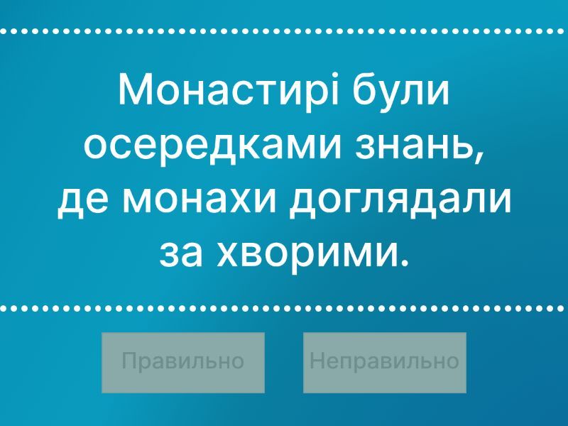 Правильно: Монастирі були осередками знань, де монахи доглядали за хворими., Лікування на Русі поєднувало народні засоби і молитви., Ізгоями могли стати люди, що втратили свій соціальний стан або були вигнані з громади., У монастирях часто створювали лікарні та притулки для хворих і старих., Монахи користувалися лікувальними травами, медом та настоями., Медицина на Русі мала як практичні, так і духовні (релігійні) основи., Неправильно: На Русі лікуванням людей займалися тільки в домашніх умовах., Ізгої — це люди, які належали до найнижчих прошарків суспільства. , Знахарі та відуни вважалися представниками офіційної церкви.,