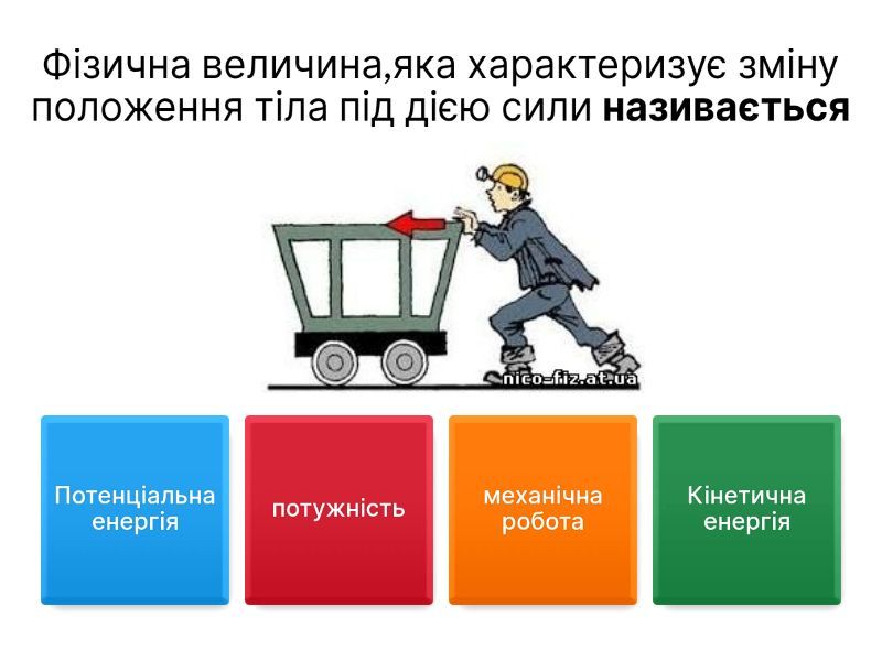1) Фізична величина,яка характеризує зміну положення тіла під дією сили називається a) Потенціальна енергія b) потужність c) механічна робота d) Кінетична енергія 2) Механічна робота визначається за формулою a) b) c) d) 3) Одиниця роботи в СІ a) Н b) Дж c) Вт d) Па 4) Фізична величина,яка характеризує швидкість виконання роботи,це... a) механічна робота b) сила c) потужність d) енергія 5) Потужність визначається за формулою a) b) c) d) 6) Одиниця потужності в СІ a) Дж b) Н c) Вт d) Па 7) Людина рівномірно підіймає вантаж на певну висоту ,тоді a) чим більша маса вантажу ,тим менша виконана робота b) потенціальна енергія вантажу зменшується c) кінетична енеогія вантажу збільшується d) чим більша висота підйому, тим більша виконується робота 8) якщо масу тіла збільшити в 2, кінетична енергія a) збільшиться в 2 рази b) збільшиться в 4 рази c) зменшиться в 2 рази d) не зміниться