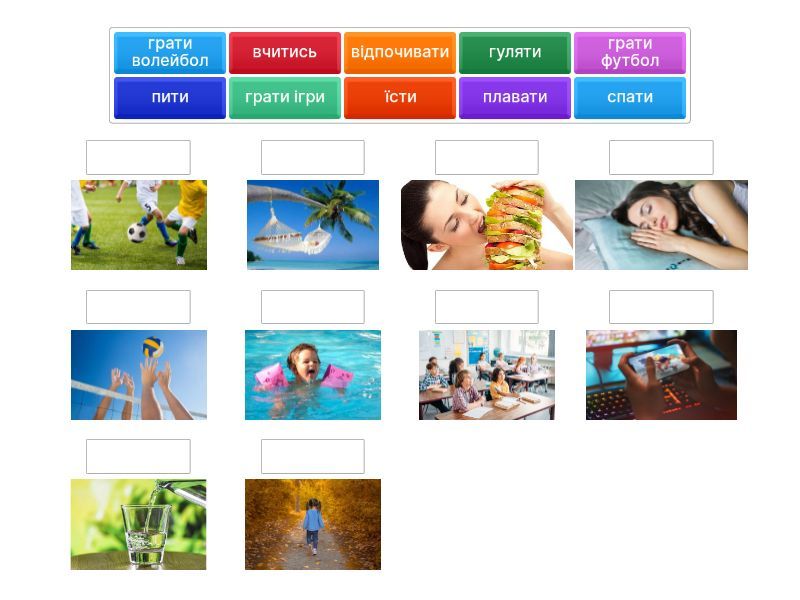 їсти, плавати, гуляти, вчитись, пити, відпочивати, спати, грати футбол, грати волейбол, грати ігри,