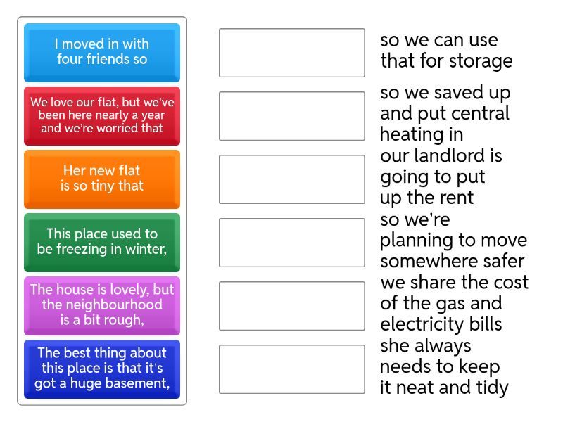 We love our flat, but we’ve been here nearly a year and we’re worried that - our landlord is going to put up the rent, I moved in with four friends so - we share the cost of the gas and electricity bills, Her new flat is so tiny that - she always needs to keep it neat and tidy, This place used to be freezing in winter, - so we saved up and put central heating in, The house is lovely, but the neighbourhood is a bit rough, - so we’re planning to move somewhere safer, The best thing about this place is that it’s got a huge basement, - so we can use that for storage,