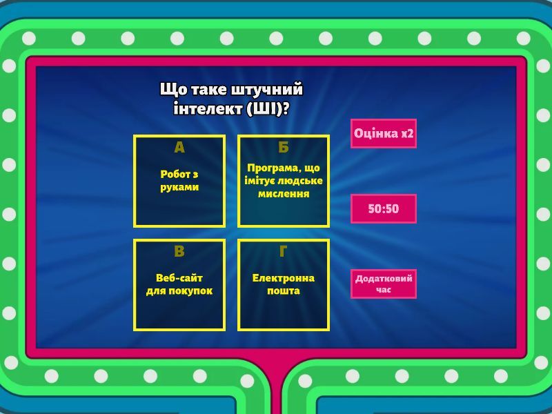 1) Що таке штучний інтелект (ШІ)? a) Робот з руками b) Програма, що імітує людське мислення c) Веб-сайт для покупок d) Електронна пошта 2) Чому варто бути обережним із використанням ШІ у наукових дослідженнях? a) Він може зламати комп’ютер b) Він завжди пише правду c) Він може створити неправдиві дані d) Він викрадає дані 3) Яка перевага пошукових систем, керованих ШІ? a) Вони працюють лише вночі b) Вони показують рекламу c) Вони швидко знаходять потрібну інформацію d) Вони блокують всі сайти 4) Яка головна небезпека «глибоких фейків» (deepfake)? a) Вони роблять навчання цікавішим b) Можуть вводити людей в оману, показуючи неправдиві відео чи фото c) Працюють лише в кіно d) Це просто мультфільми 5) Що треба робити, щоб розпізнати глибокий фейк? a) Перевірити джерело та уважно подивитися на деталі зображення b) Повірити першому, що побачив c) Поділитися відео в соцмережі d) Завжди довіряти будь-якому ролику 6) Яке правило безпечного використання ШІ у творчості найважливіше? a) Не вказувати, що тобі допомагав ШІ b) Використовувати ШІ лише як помічник, а не для обману c) Копіювати все, що він створює d) Не перевіряти результати