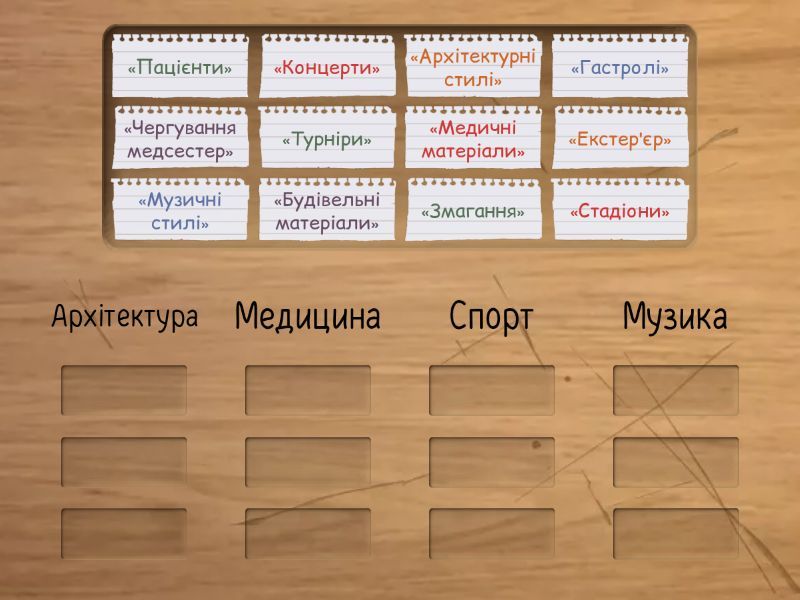 Архітектура: «Архітектурні стилі» , «Екстер'єр», «Будівельні матеріали», Медицина: «Пацієнти» , «Медичні матеріали», «Чергування медсестер», Спорт: «Змагання» , «Стадіони», «Турніри», Музика: «Музичні стилі» , «Концерти», «Гастролі»,