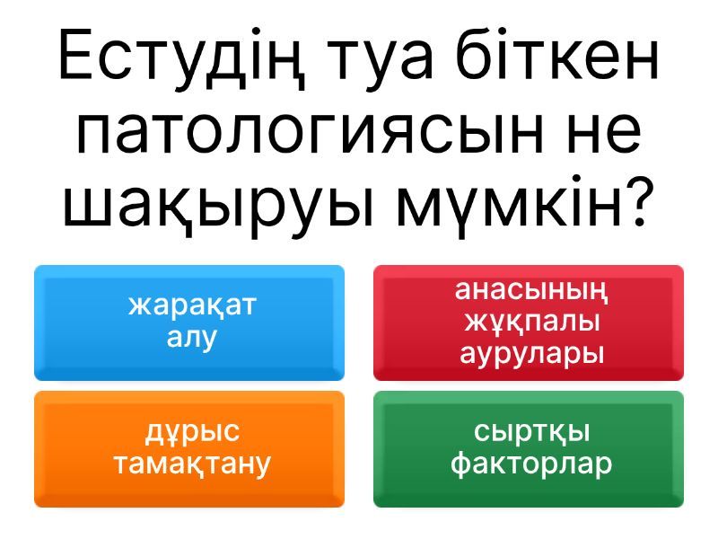 1) Естудің туа біткен патологиясын не шақыруы мүмкін? a) жарақат алу b) анасының жұқпалы аурулары c) дұрыс тамақтану d) сыртқы факторлар 2) Керең-мылқаулық дегеніміз не? a) Сөйлеу аппараты зақымдалуы b) Туа біткен не ерте шақтағы естудің жоғалуы c) ересек шақтағы уақытша есту бұзылысы d) кұлақ пішінінің өзгерісі 3) Саңырау балалар қанша топқа бөлінеді? a) 2 b) 3 c) 4 d) 7 4) 1-топтағы саңырау балалар қандай дыбыстарды ажырата алмайды? a) Дауысты дыбыстар b) Қатты дыбыстар c) Орташа дыбыстар d) Фразаларды 5) Саңыраулық кезінде мылқаулықтың пайда болу себебі неде? a) Сөйлеу мүшесінің зақымдануы b) Есту түйсігінің жоқтығы c) Тіл бұлшықеттерінің әлсіздігі d) Жүйке аурулары 6) Саңырау балалардың көбісі қандай дыбыстарды ажыратады? a) Төменгі және орташа жиілікті b) Тек жоғары жиілікті c) Тек музыкалық дыбыстарды d) Мүлдем естімейді 7) Есту қалдығын анықтау үшін қандай әдіс қолданылады? a) Аудиометрия b) Электрокардиограмма c) Флюорография d) Электроэнцефалография 8) Аудиометрия не үшін жүргізіледі? a) Есту қабілетінің деңгейін анықтау үшін b) Тыныс алу жүйесін тексеру c) Жүрек соғуын өлшеу d) Көру өткірлігін анықтау 9) 4-топтағы балалар қандай қашықтықтағы сөздерді ести алады? a) 0,5 метр b) 2 метр c) 5 метр d) 1 метр 10) Нашар еститін балалардың сөйлеуінің дамуына не әсер етеді? a) Есту дәрежесі b) Көру қабілеті c) Жас шамасы d) Қимыл белсенділігі 11) Құлақ мүкістігі дегеніміз не a) Екі құлақтың да естуінің төмендеуі b) Тек бір құлақтың зақымдалуы c) Уақытша есту бұзылысы d) Көрудің нашарлауы 12) 2-дәрежелі нашар еститін балалар сөйлеуді қалай қабылдайды? a) 1 метрге дейін b) 5 метрге дейін c) 10 метрге дейін d) тек дыбысты ғана