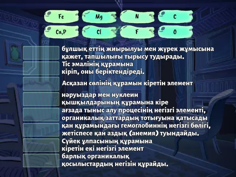 Cl - Асқазан сөлінің құрамын кіретін элемент, Ca,P - Сүйек ұлпасының құрамына кіретін екі негізгі элемент, F - Тіс эмалінің құрамына кіріп, оны беріктендіреді., C - барлық органикалық қосылыстардың негізін құрайды., N - нәруыздар мен нуклеин қышқылдарының құрамына кіре, O - ағзада тыныс алу процесінің негізгі элементі, органикалық заттардың тотығуына қатысады, Mg - бұлшық еттің жиырылуы мен жүрек жұмысына қажет, тапшылығы тырысу тудырады., Fe - қан құрамындағы гемоглобиннің негізгі бөлігі, жетіспесе қан аздық (анемия) туындайды.,