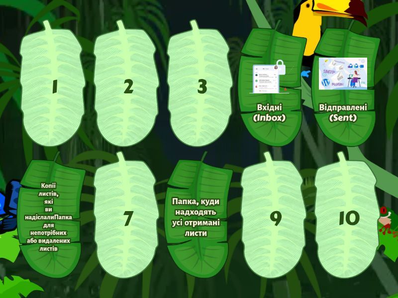 Вхідні (Inbox) - Папка, куди надходять усі отримані листи, Відправлені (Sent) - Копії листів, які ви надіслалиПапка для непотрібних або видалених листів, Чернетки (Drafts) - Листи, написані вами, але ще не відправленіПапка, куди надходять усі отримані листи, Спам (Spam) - Папка для автоматичного виявлення непроханих рекламних листів, Кошик (Trash) - Папка для непотрібних або видалених листів,