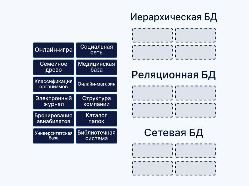 Иерархическая БД: Семейное древо, Каталог папок, Структура компании, Классификация организмов, Реляционная БД: Электронный журнал, Онлайн-магазин, Медицинская база, Университетская база, Сетевая БД: Социальная сеть, Библиотечная система, Бронирование авиабилетов, Онлайн-игра,