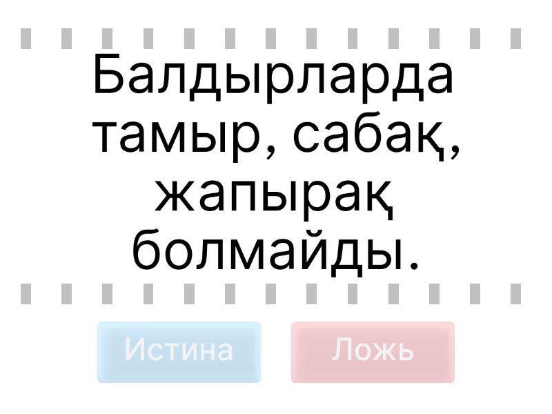 Истина: Балдырларда тамыр, сабақ, жапырақ болмайды., Мүктер ылғалды жерде өседі., Жоғарғы сатыдағы өсімдіктердің гүлдері болады., Ложь: Қарағай – төменгі сатыдағы өсімдік., Балдырлар тек құрлықта өседі., Мүктердің тамыры өте ұзын болады.,