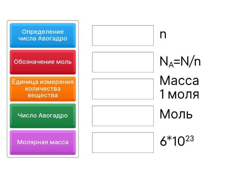 Единица измерения количества вещества - Моль, Число Авогадро - 6*1023, Обозначение моль - n, Определение числа Авогадро - NA=N/n, Молярная масса - Масса 1 моля,