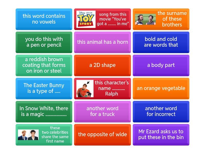 you do this with a pen or pencil - write, a body part - shoulder / wrist, this animal has a horn - rhino, this word contains no vowels - rhythm, The Easter Bunny is a type of ..... - rabbit, the surname of these brothers - Henry, this character's name ............ Ralph - Wreck it, Mr Ezard asks us to put these in the bin - rubbish / wrappers, bold and cold are words that - rhyme, these two celebrities share the same first name - Harry, In Snow White, there is a magic ................... - mirror, a reddish brown coating that forms on iron or steel - rust, the opposite of wide - narrow, another word for incorrect - wrong, another word for a truck - lorry, an orange vegetable - carrot, a 2D shape - rhombus, song from this movie "You've got a ......... in me" - friend,