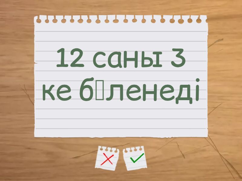 5 тақ сан - Иә, 3×8=24 - Иә, дөңгелектің бұрышы бар - Жоқ. Дөңгелекте бұрыш болмайды, 12 саны 3 ке бөленеді - Иә, 9-жұп сан - Жоқ , 0 натурал сан - Жоқ, 1 саны жай сан - Жоқ, Шаршының барлық қабырғалары тең - Иә, Үшбұрыштың үш қабырғасы бар - Жоқ, 12 саны 3 ке бөлінеді - Иә,