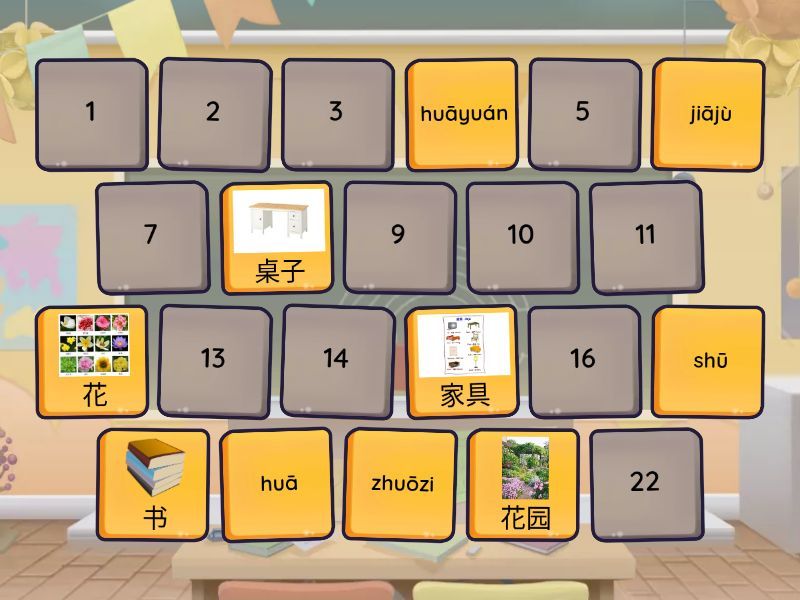 jiājù - 家具, huā - 花, huāyuán - 花园, shū - 书, zhuōzi - 桌子, shūzhuō - 书桌, gānjìng - 干净, zhěngqí - 整齐, piàoliang - 漂亮, zhēn - 真, nǐmen de - 你们的,