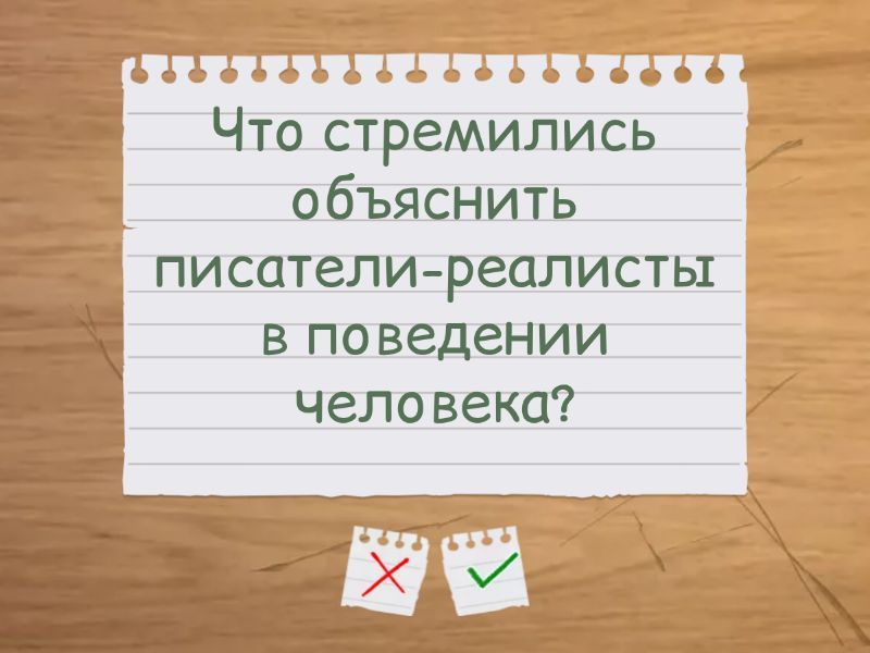 Основной принцип реализма - Правдивое изображение действительности, Что пришло на смену романтизму в литературе середины XIX века? - Реализм, Типичный герой реалистического произведения - Обычный человек в обычных обстоятельствах, Кто считается одним из основателей русского реализма? (Назови одну фамилию) - Пушкин, Какой приём, используемый реалистами, означает описание мельчайших подробностей? - Деталь, Основной конфликт в реалистическом произведении - Герой и общество, Назови один из жанров, в котором особенно ярко проявился реализм - Роман, Какая наука повлияла на становление реализма? - История, Что стремились объяснить писатели-реалисты в поведении человека? - Влияние среды и обстоятельств, Кто из русских писателей-реалистов подробно исследовал тему «маленького человека»? - Гоголь,
