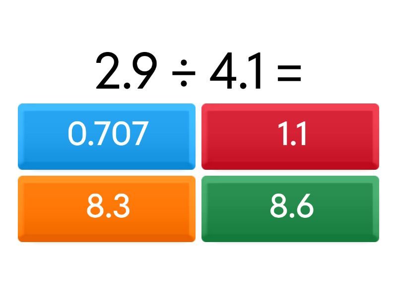 1) 2.9 ÷ 4.1 = a) 0.707 b) 1.1 c) 8.3 d) 8.6 2) 5 ÷ 4.3 = a) 1.162... b) 1.8 c) 5.4 d) 7.4 3) 8.4 ÷ 9.7 = a) 0.865... b) 5.6 c) 6 d) 8.2 4) 6.5 ÷ 8.5 = a) 0.764... b) 0.3 c) 2.2 d) 6.7 5) 7.6 ÷ 1.2 = a) 0.1 b) 4.5 c) 4.6 d) 6.333 6) 0.6 ÷ 3 = a) 0.2 b) 2.7 c) 3.4 d) 9.5 7) 2.1 ÷ 2.6 = a) 0.807... b) 5.7 c) 7.3 d) 10 8) 5.9 ÷ 6.8 = a) 0.867... b) 0.2 c) 0.8 d) 4.2 9) 7.5 ÷ 0.4 = a) 3.1 b) 6.1 c) 8 d) 18.75 10) 1.5 ÷ 6.4 = a) 0.234 b) 2.3 c) 3.3 d) 8.8