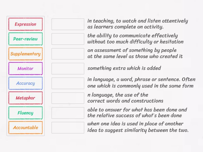 Fluency - the ability to communicate effectively without too much difficulty or hesitation, Accuracy - n language, the use of the correct words and constructions, Expression - in language, a word, phrase or sentence. Often one which is commonly used in the same form, Metaphor - when one idea is used in place of another idea to suggest similarity between the two., Monitor - in teaching, to watch and listen attentively as learners complete an activity., Peer-review - an assessment of something by people at the same level as those who created it, Supplementary - something extra which is added, Accountable - able to answer for what has been done and the relative success of what’s been done,