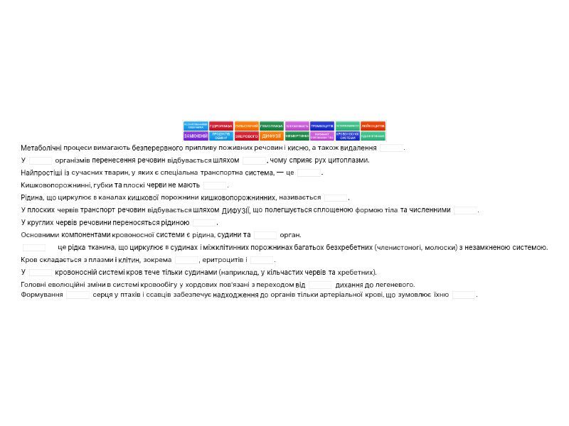 Метаболічні процеси вимагають безперервного припливу поживних речовин і кисню, а також видалення ____. У ____ організмів перенесення речовин відбувається шляхом ____, чому сприяє рух цитоплазми. Найпростіші із сучасних тварин, у яких є спеціальна транспортна система, — це ____. Кишковопорожнинні, губки та плоскі черви не мають ____. Рідина, що циркулює в каналах кишкової порожнини кишковопорожнинних, називається ____. У плоских червів транспорт речовин відбувається шляхом ДИФУЗІЇ, що полегшується сплощеною формою тіла та численними ____. У круглих червів речовини переносяться рідиною ____. Основними компонентами кровоносної системи є рідина, судини та ____ орган. ____ — це рідка тканина, що циркулює в судинах і міжклітинних порожнинах багатьох безхребетних (членистоногі, молюски) з незамкненою системою. Кров складається з плазми і клітин, зокрема ____, еритроцитів і ____. У ____ кровоносній системі кров тече тільки судинами (наприклад, у кільчастих червів та хребетних). Головні еволюційні зміни в системі кровообігу у хордових пов’язані з переходом від ____ дихання до легеневого. Формування ____ серця у птахів і ссавців забезпечує надходження до органів тільки артеріальної крові, що зумовлює їхню ____.