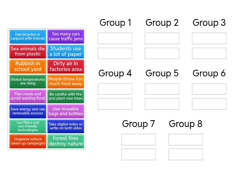 Group 1: People throw too much food away, Plan meals and avoid wasting food, Group 2: Students use a lot of paper, Take digital notes or write on both sides, Group 3: Too many cars cause traffic jams, Use bicycles or carpool with friends, Group 4: Sea animals die from plastic, Use reusable bags and bottles, Group 5: Global temperatures are rising, Save energy and use renewable sources, Group 6: Rubbish in school yard, Organize school clean-up campaigns, Group 7: Forest fires destroy nature, Be careful with fire and plant new trees, Group 8: Dirty air in factories area, Use filters and eco-friendly technologies,