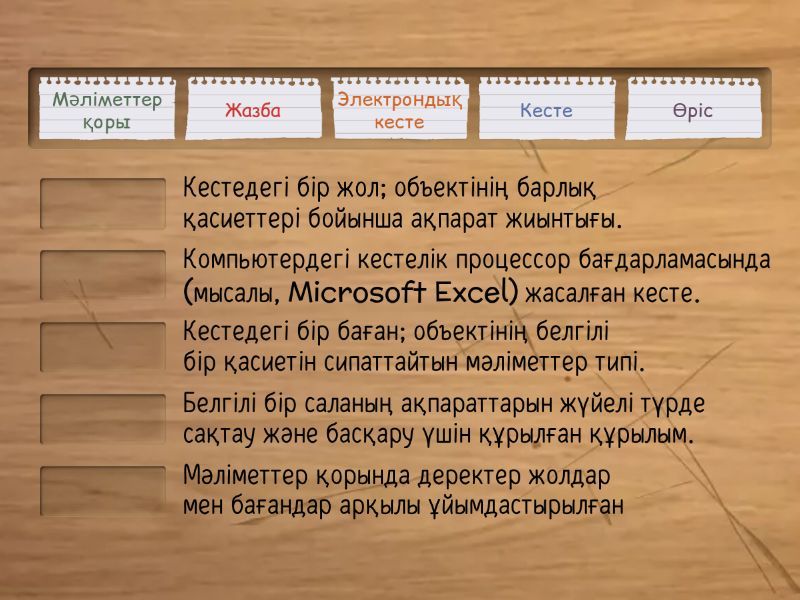 Мәліметтер қоры - Белгілі бір саланың ақпараттарын жүйелі түрде сақтау және басқару үшін құрылған құрылым., Кесте - Мәліметтер қорында деректер жолдар мен бағандар арқылы ұйымдастырылған, Электрондық кесте - Компьютердегі кестелік процессор бағдарламасында (мысалы, Microsoft Excel) жасалған кесте., Жазба - Кестедегі бір жол; объектінің барлық қасиеттері бойынша ақпарат жиынтығы., Өріс - Кестедегі бір баған; объектінің белгілі бір қасиетін сипаттайтын мәліметтер типі.,